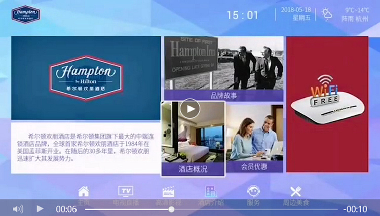 2020年1月份本公司承接三亞未名湖公園希爾頓歡朋酒店智慧酒店IPTV網(wǎng)絡(luò)互動(dòng)電視系統(tǒng)工程方案設(shè)計(jì),遠(yuǎn)程安裝施工一條龍服務(wù)。酒店按總部要求只能接入正版合法的廣電有線電視信號(hào)做為電視節(jié)目源,并且要保證中央臺(tái)3 5 6 8都能正常收看,必須到廣電部門審請(qǐng)50臺(tái)高清數(shù)字電視機(jī)頂盒,做為200多套客房的電視節(jié)目源,美樂視公司提供機(jī)房配置清單如下:智慧酒店IPTV互動(dòng)電視系統(tǒng)服務(wù)器1臺(tái),八路高清編碼器7臺(tái),遠(yuǎn)程指導(dǎo)酒店弱電工程商,三個(gè)工作日完設(shè)備調(diào)試安裝,交付酒店試營業(yè)。
