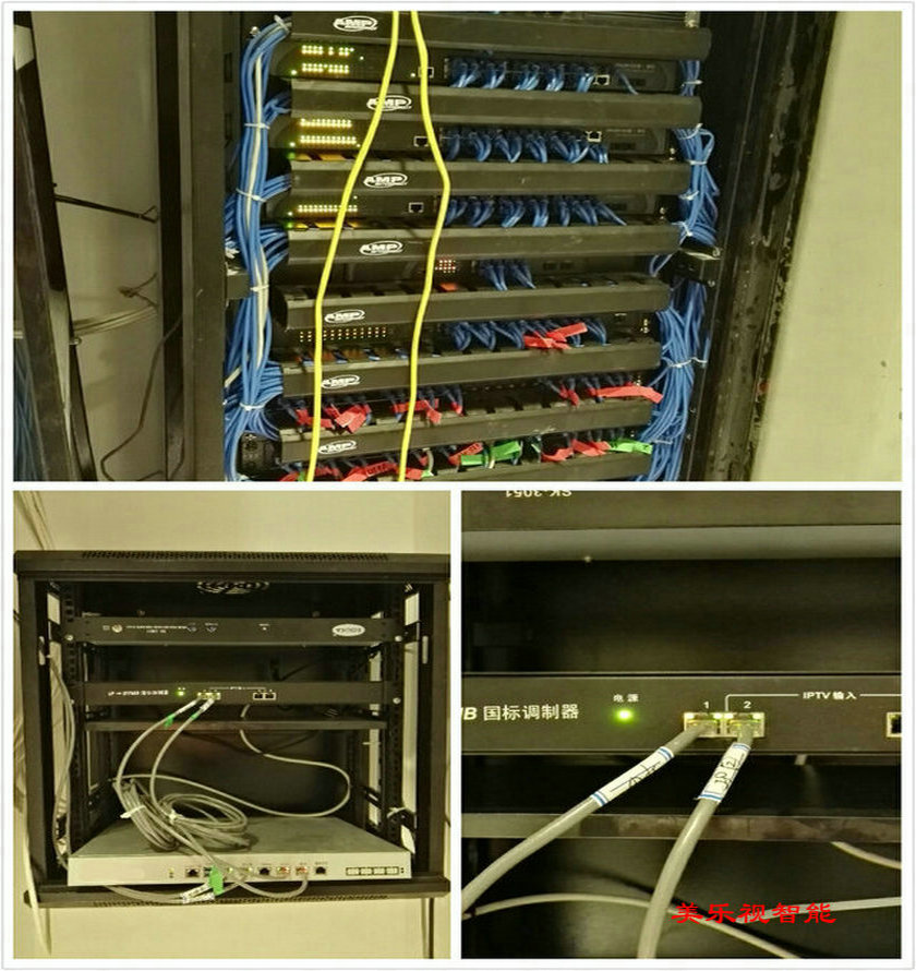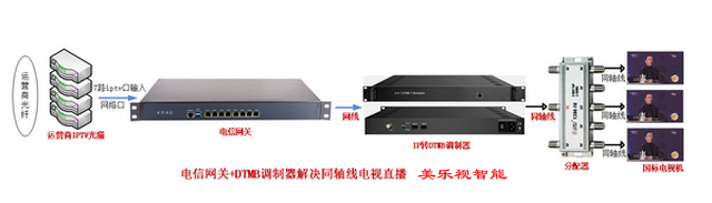 本公司為麗楓酒店時代城店承接,設(shè)計,施工,安裝一站式服務(wù),前端電視機房設(shè)計為IPTV電視直播解決方案,只用了寬帶運營商2個IPTV光貓共采集46套標清IPTV電視節(jié)目,接入IP-DTMB國標數(shù)字調(diào)制器走閉路有線電視線路傳輸?shù)?0個房間,整個電視前端機房核心設(shè)備只需要三臺就可以完成,不占用機房空間,安裝方便簡捷。安裝示意圖如下: