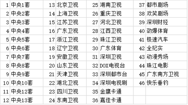 80套客房共計100臺電視機全部可以收看46套標清數(shù)字電視節(jié)目,節(jié)目源直接從電信IPTV光貓采集,不需要電視機頂盒參與,安裝省事簡單,幫酒店節(jié)省大量收視費,機房設(shè)備安裝清單:IPTV網(wǎng)關(guān)1臺,DTMB國標數(shù)字調(diào)制1臺,共計二臺設(shè)備搞定。從機房到客房整個閉路電視線路沒有用過一臺電視信號放大器,得益于數(shù)字電視信號高保真?zhèn)鬏?,抗干擾衰減小,不產(chǎn)生雪花點,條紋,馬賽克等模擬電視信號常見現(xiàn)象和故障,售后維護成本極低,46套節(jié)目如下表: