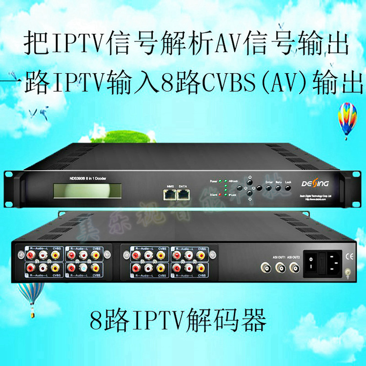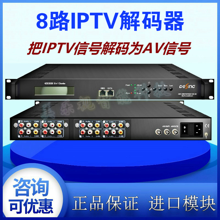 產(chǎn)品推薦說明:八路IPTV轉(zhuǎn)音視頻解碼器主要功能就是把運(yùn)營商IPTV光貓輸出的8路組播地址解碼編輯成標(biāo)準(zhǔn)紅,黃,白,三色音視頻AV輸出,再次接入到模擬射頻調(diào)制器設(shè)備,實(shí)現(xiàn)到把IPTV信號(hào)源轉(zhuǎn)換成模擬有線電視信號(hào)輸出的功能,此款設(shè)備適用于僅限于做模擬電視前端方案的酒店,賓館,會(huì)所,沐足,工廠宿舍等單位,有興趣的朋友可以來電咨詢 18688658150 田工,或加我微信337288971詳談!