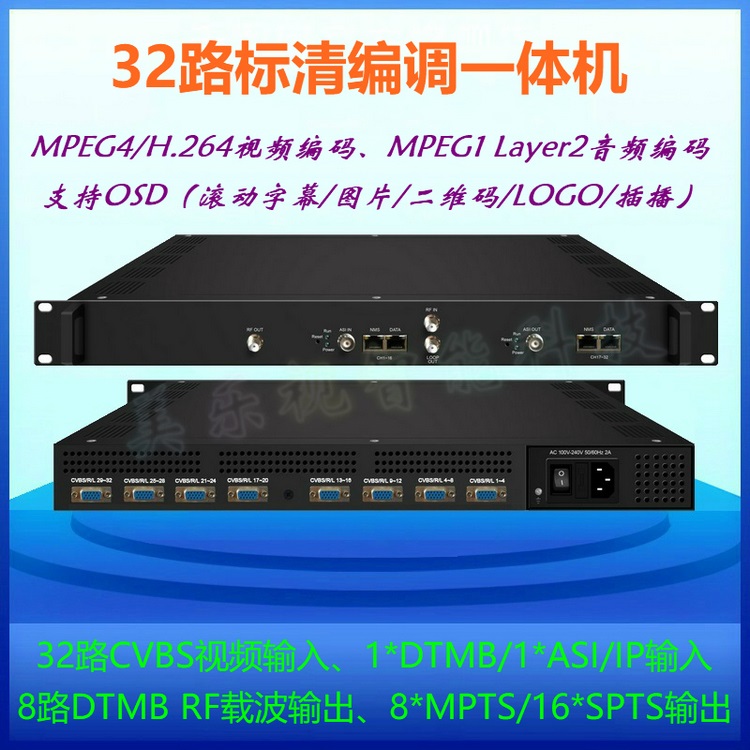 32路標(biāo)清編調(diào)一體機是我公司最新研發(fā)的集編碼和調(diào)制于一體的高性價比圖文編調(diào)設(shè)備。該設(shè)備支持OSD功能,可在每路編碼視頻中插入圖片、二維碼、文字等信息,具有高集成度、高性能、低成本的特點,單臺設(shè)備集成了一套前端系統(tǒng)功能,非常適用于酒店、會所、醫(yī)院、浴場等IPTV數(shù)字電視系統(tǒng)。