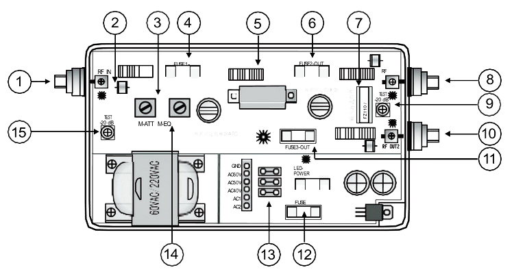 | 1 | RF輸入端口 | 6 | OUT1過(guò)流選擇保險(xiǎn)管 | 11 | OUT2過(guò)流選擇保險(xiǎn)管 |