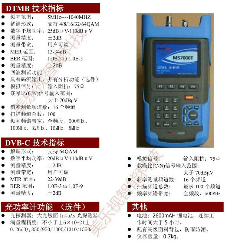 無線地面波DTMB/有線DVB-C數(shù)字電視/模擬電視信號分析儀/場強儀