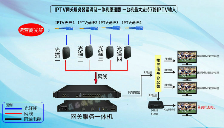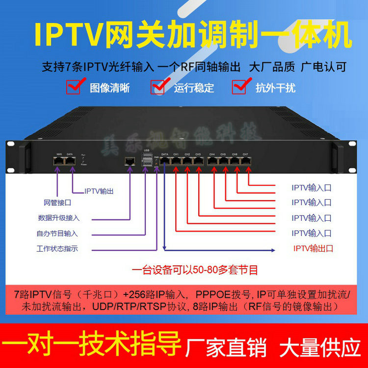 IPTV網(wǎng)關(guān)調(diào)制器一體機支持7路運營商IPTV信號源輸入,支持PPPOE運營商網(wǎng)絡撥號功能,經(jīng)過調(diào)制輸出八個載波DTMB RF有線數(shù)字信號,可直接接入DTMB國標數(shù)字電視機或地面波數(shù)字機頂盒播放節(jié)目,建設費用和運營成本低。同時支持劃分一路網(wǎng)口輸出IP單播節(jié)目流,接入網(wǎng)絡傳輸終端智能電視機播放節(jié)目,雙路輸出數(shù)字電視前端解決酒店,賓館,醫(yī)院,會所,茶樓等營業(yè)性場所不同傳輸線路媒介,造成不同層次終端需求的問題,真正做到一臺設備完成兩路不同媒介信號傳輸。