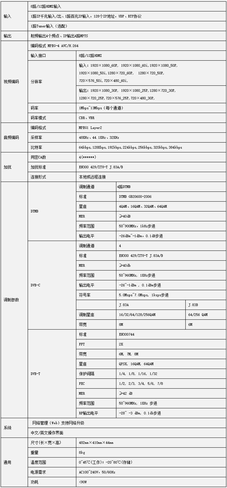 高清編碼調(diào)制一體機是最新研發(fā)的集高清編碼和調(diào)制于一體的高性價比設(shè)備。該設(shè)備支持4路/8路/12路/24路HDMI輸入、1路千兆IP輸入+1路百兆IP輸入;支持4個DTMB單載波輸出或4路MPTS輸出。該設(shè)備具有高集成度、高性能、低成本的特點,單臺設(shè)備集成了一套前端系統(tǒng)功能,非常適用于酒店、會所、醫(yī)院、浴場等數(shù)字電視系統(tǒng)。