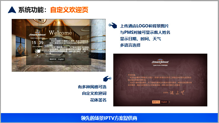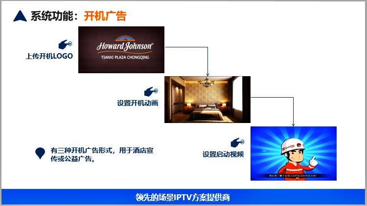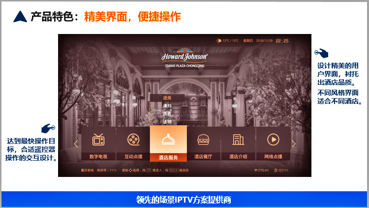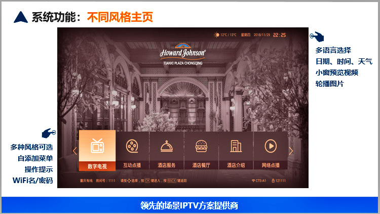 美樂視智慧酒店IPTV互動電視系統(tǒng)服務(wù)器具有電信網(wǎng)關(guān)功能、可匯聚多方資源的直播、點播、酒店服務(wù)酒店增值等為一體的服務(wù)器,滿足搭建智慧酒店的IPTV互動電視基本要求.可以實現(xiàn)酒店歡迎頁、酒店LOGO展示、電視直播、高清點播、酒店風(fēng)采營銷廣告(視頻區(qū)和圖文區(qū))、滾動字幕、自辦頻道、自辦圖文頻道自辦視頻頻道、開機鎖定頻道、微信二維碼推送公眾號、WIFI密碼展示或掃描獲取、頻道排序、其他增值服務(wù)等。