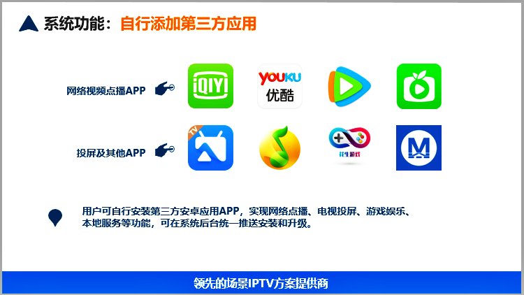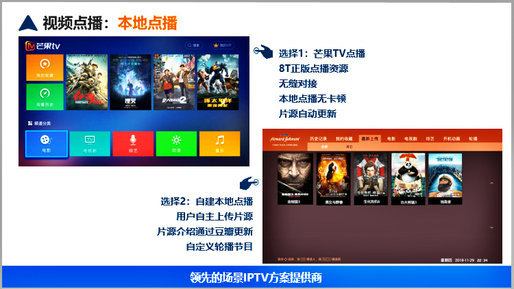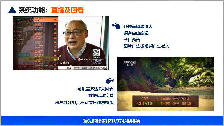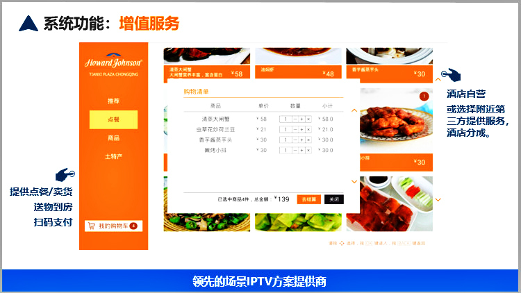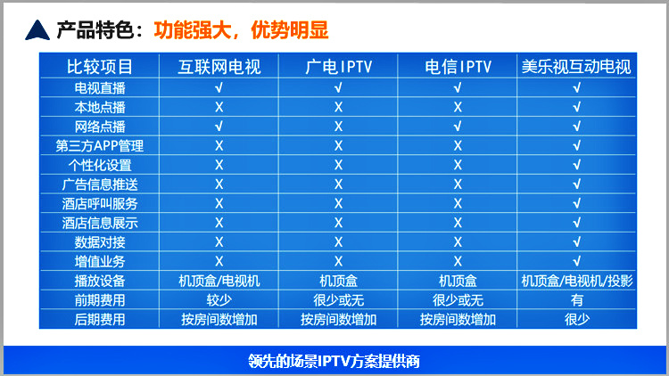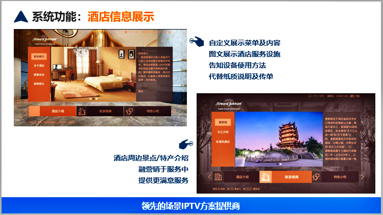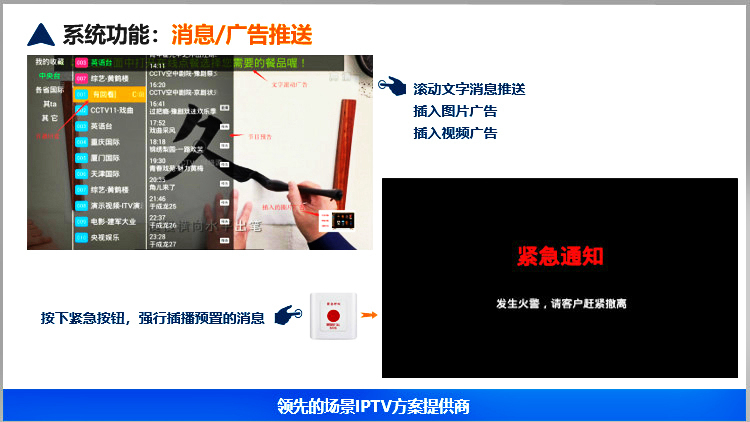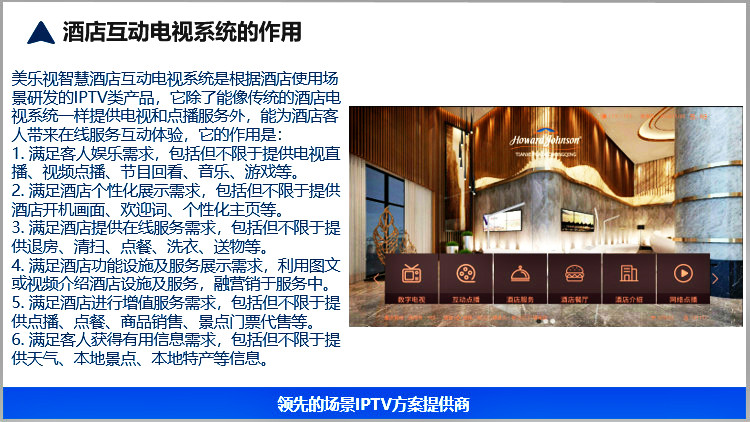 高端智慧酒店IPTV互動電視系統(tǒng)服務(wù)器具有電信網(wǎng)關(guān)功能、可匯聚多方資源的直播、點播、酒店服務(wù)酒店增值等為一體的服務(wù)器,滿足搭建智慧酒店的IPTV互動電視基本要求.可以實現(xiàn)酒店歡迎頁、酒店LOGO展示、電視直播、高清點播、酒店風(fēng)采營銷廣告(視頻區(qū)和圖文區(qū))、滾動字幕、自辦頻道、自辦圖文頻道自辦視頻頻道、開機鎖定頻道、微信二維碼推送公眾號、WIFI密碼展示或掃描獲取、頻道排序、其他增值服務(wù)等。歡迎您來電咨詢!