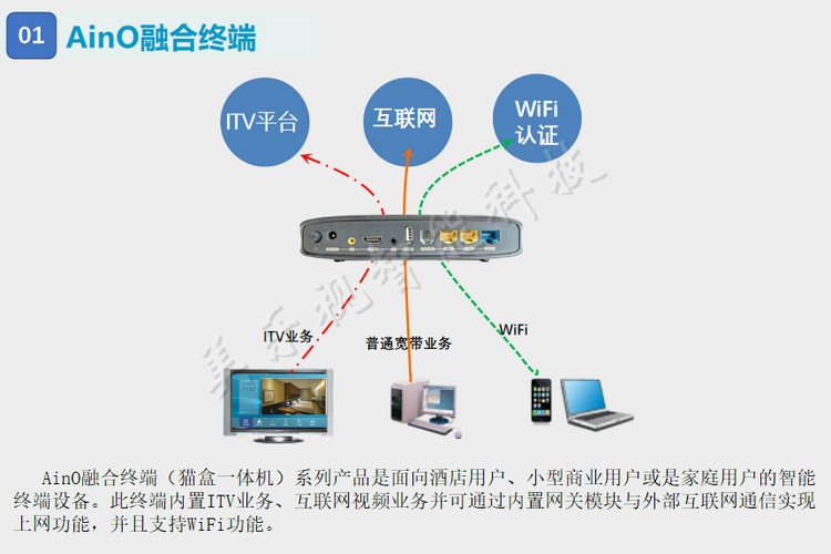 AinO融合終端(貓盒一體機(jī))系列產(chǎn)品是面向酒店用戶、小型商業(yè)用戶或是家庭用戶的智能終端設(shè)備。此終端內(nèi)置ITV業(yè)務(wù)、互聯(lián)網(wǎng)視頻業(yè)務(wù)并可通過內(nèi)置網(wǎng)關(guān)模塊與外部互聯(lián)網(wǎng)通信實(shí)現(xiàn)上網(wǎng)功能,并且支持WiFi功能。