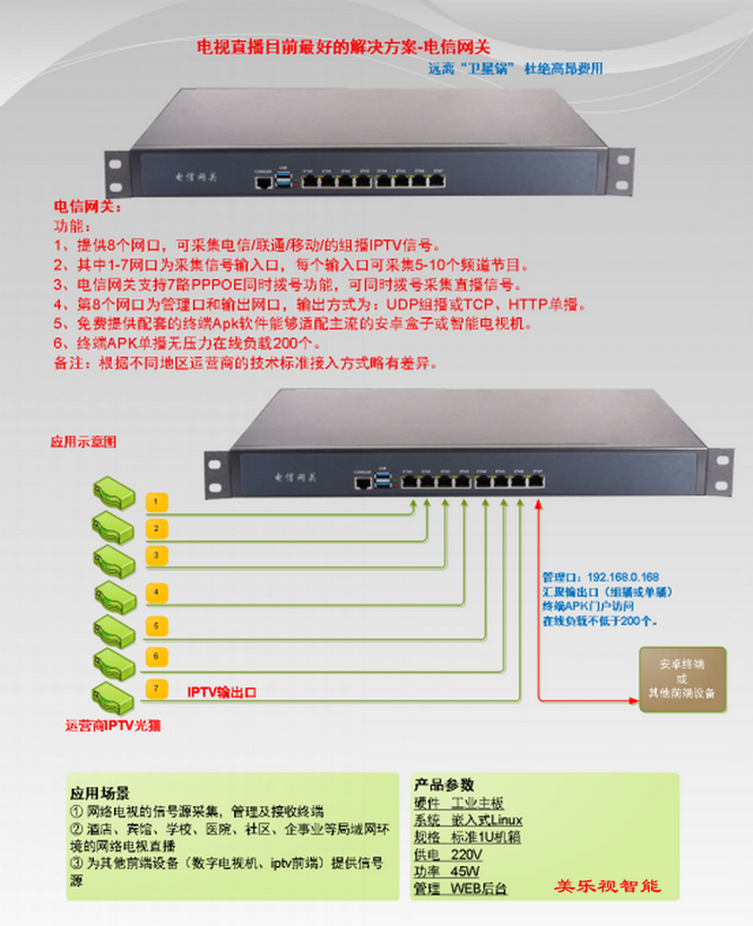 電信網(wǎng)關(guān)可采集運(yùn)營商IPTV直播信號(hào),匯聚直播信號(hào)后統(tǒng)一輸出到酒店局域網(wǎng)內(nèi),配合酒店的智能電視機(jī)安裝終端APP軟件,解決電視直播問題及其他增值問題。