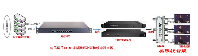 采用電信網(wǎng)關(guān)匯聚運(yùn)營商IPTV直播信號(hào),然后把信號(hào)輸入到IP轉(zhuǎn)DTMB調(diào)制器,輸出同軸線的電視信號(hào),通過電視的分配網(wǎng)絡(luò),每臺(tái)電視收看不同的頻道。