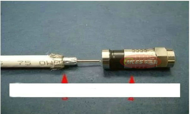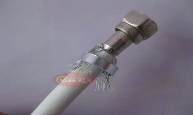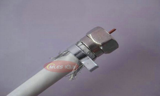 套上F頭卡環(huán),銅芯一般應(yīng)留10mm左右,然后插入F頭,銅芯應(yīng)高出F頭外口約5 mm
