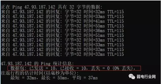 從以上我就可以知道在給47.93.187.142發(fā)送10個數(shù)據(jù)包的過程當中,返回了10個,沒有丟失,這10個數(shù)據(jù)包當中返回速度最快為32ms,最慢為55ms,平均速度為37ms。說明我的網(wǎng)絡(luò)良好。