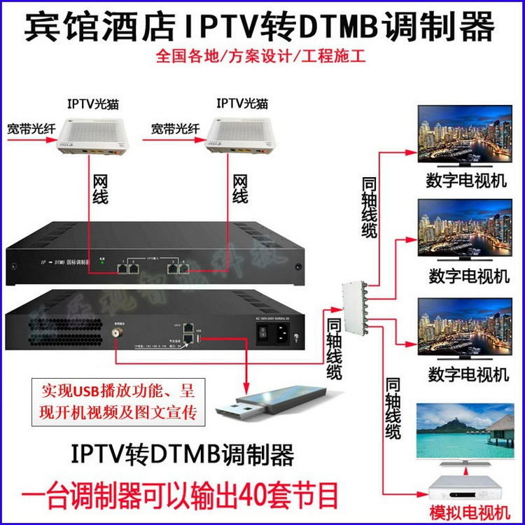全新開發(fā)的電信/聯(lián)通/移動IPTV碼流轉(zhuǎn)DTMB數(shù)字信號一體機(jī),只需開通2-4條寬帶光貓,即可轉(zhuǎn)換30-50套數(shù)字節(jié)目,杜絕了以前老式模擬信號因布線老化或不規(guī)范引起的模糊、雪花、不清晰等問題。老賓館原來線路無需改動直接使用效果一樣好。
