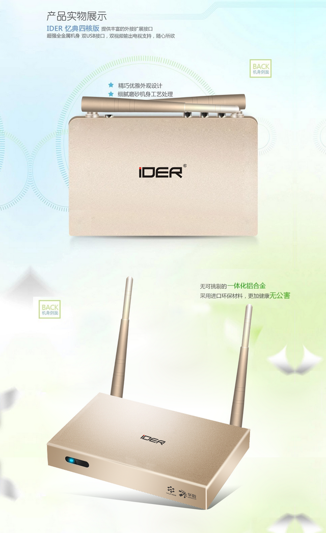 M1土豪金:四核最佳智能網(wǎng)絡(luò)機(jī)頂盒,搭載最新獨(dú)家YI-tv OS 3.0版系統(tǒng),整合最強(qiáng)大網(wǎng)絡(luò)直播;全網(wǎng)搜索;集成最具體驗(yàn)電視直播:秒速換臺(tái)。融合最人性化界面,影視搜索、最熱推薦、一鍵清理等深度功能。土豪金還擁有擁有強(qiáng)大的本地視頻播放能力,連接USB磁盤,完美全格式全高清播放,輕松播放所有視頻媒體。